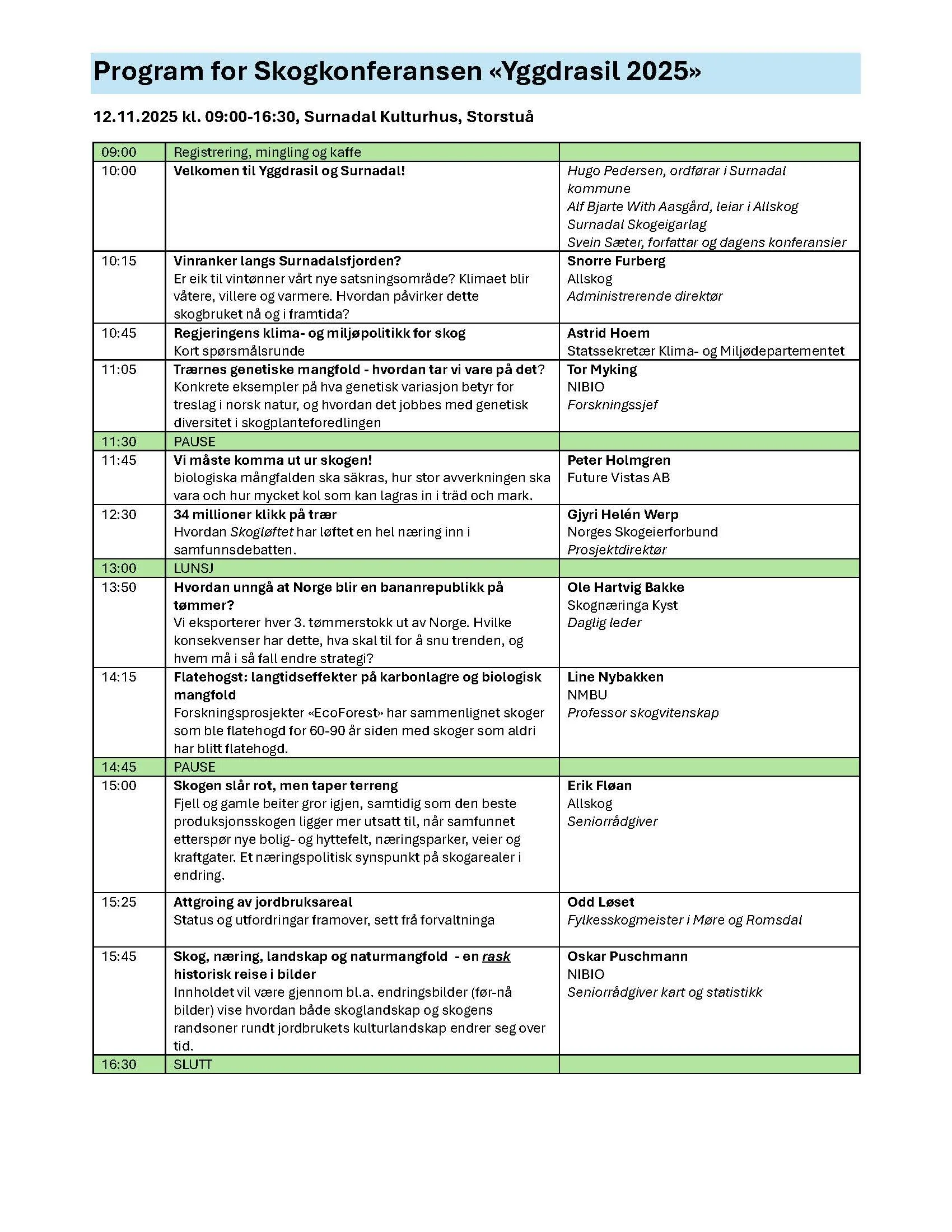 Skogkonferansen Yggdrasil i 2023 ble en stor suksess med interessante og varierte foredrag og godt over 100 fornøyde deltakere. 12. november i år inviterer vi til Yggdrasil 2025, på samme sted som sist – Storstuå i Surnadal Kulturhus.